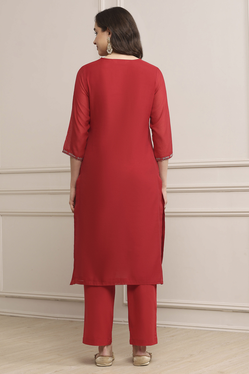 Make a statement this festive season with this red art silk suit set. Featuring a straight kurta with sequin detailing, paired with slim pants and a matching dupatta, it blends elegance and festive charm effortlessly.